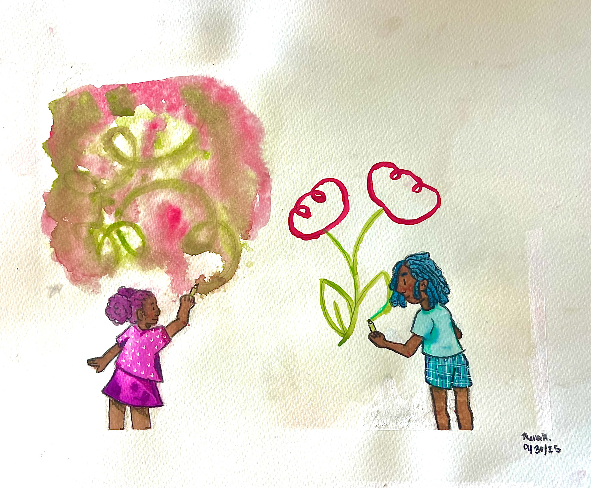 Watercolor, ink, and colored pencils on water colored paper